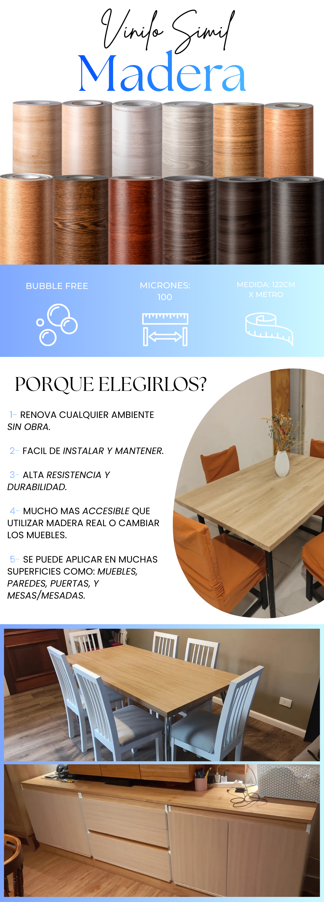 El vinilo en rollo es ideal para forrar alacenas, modernizar muebles, cajoneras, puertas, paredes. Son lavables, protegen las superficies y no dejan residuos al sacarlos.